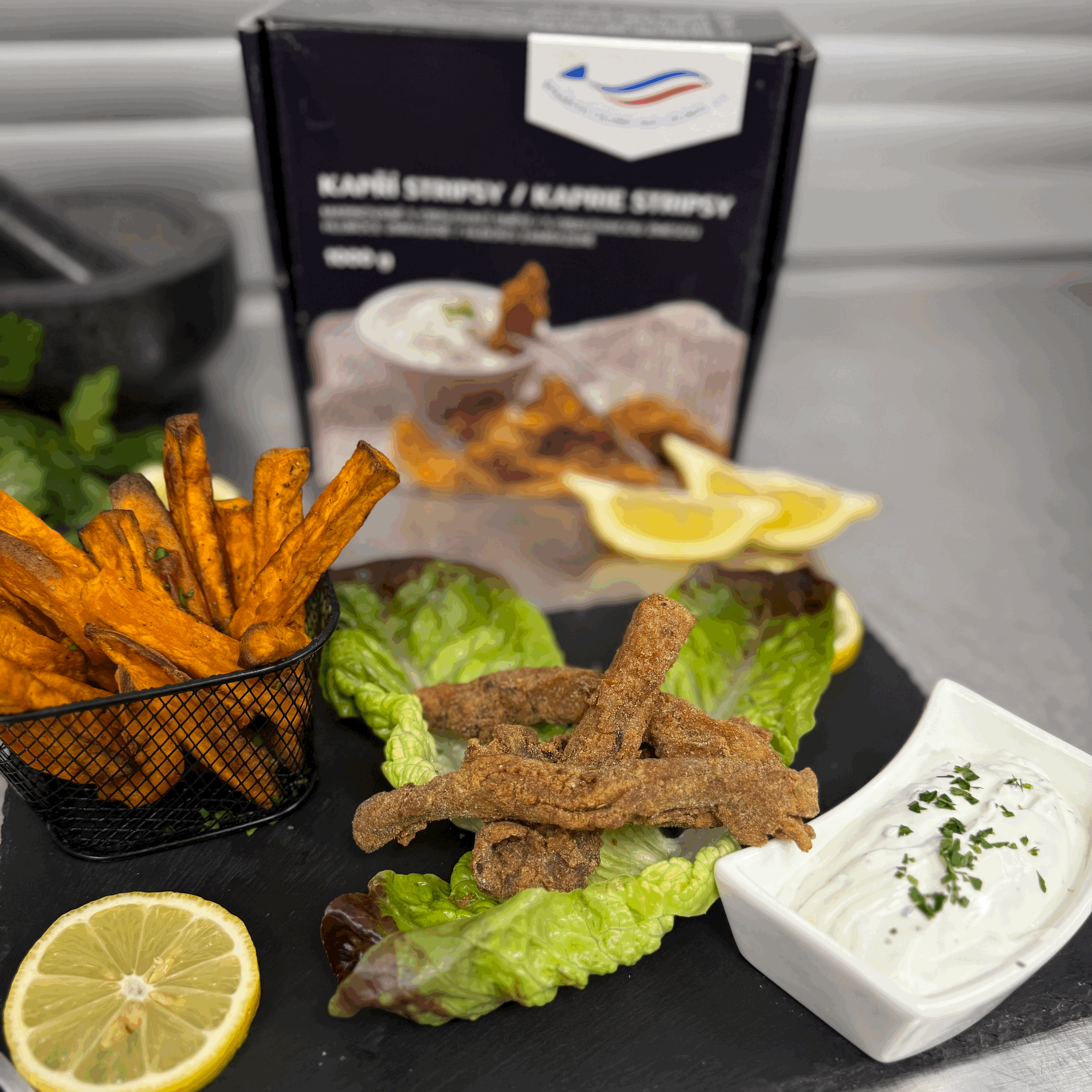 Vyzkoušejte marinované proužky z kapřího filetu (cca 2 cm široké), obalené v jedinečné směsi koření a obalovací směsi pro dokonalou křupavost. Každé sousto spojuje jemné maso kapra s lahodně křehkou krustou.